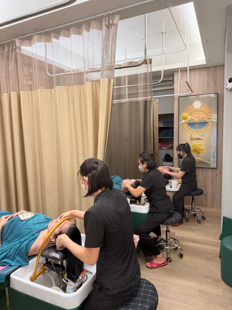 越式洗頭從最專業的按摩開始到天然草本燻蒸及光療水循環做結束,整個過程您只要乖乖躺平就可以讓您帶來前所未有的放鬆體驗。老闆娘雖然是道地越南人,但是我們非常講究按摩這塊在客人身上這部分,所以按摩手法大部分以台灣人所需要為主,再搭配正宗越式洗頭方式,按摩部分主要有頭部、肩頸、手部、腳部到背部按摩再搭配黑熱石按摩,讓您釋放日積月累的緊繃與疲憊,另外背部按摩還包含指壓與油壓部分及看顧客需求做拔罐刮痧服務。為了讓您更全面地調理身心,我們提供足部浴療、去角質、臉部撥筋,幫助肌膚重現光澤與彈性,還有許多顧客最愛體驗的療程——採耳、耳燭、水療,讓你從身體到感官都獲得療癒與舒暢。